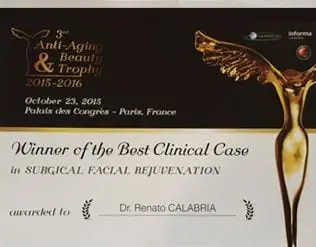 Il Dott. Calabria ha ricevuto il premio per Miglior caso clinico di ringiovanimento chirurgico facciale durante la terza edizione dell’evento annuale Anti-Aging & Beauty Trophy 2015-2016 svoltosi a Parigi, Francia.